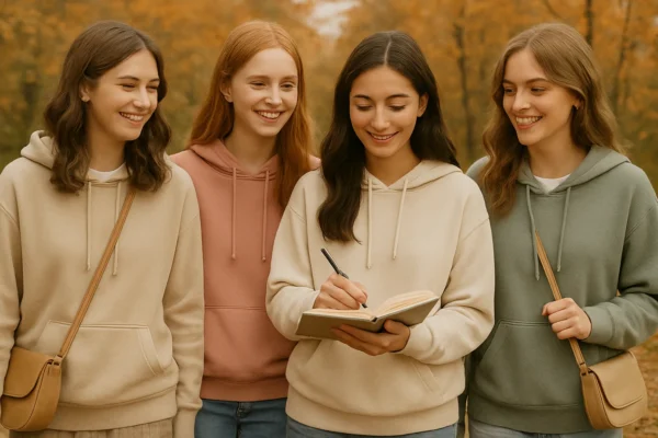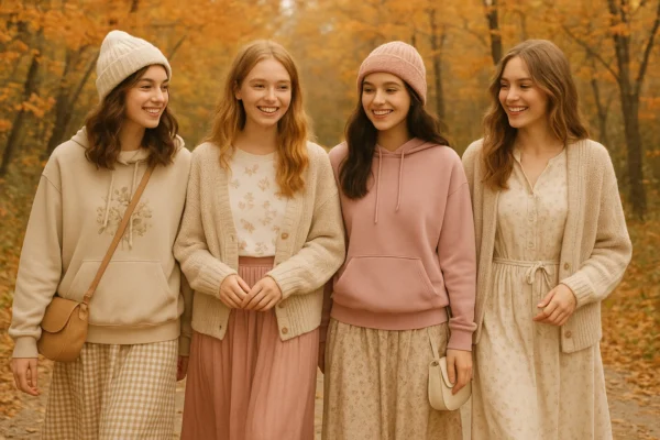 If you’re leaning into a softer, more romantic vibe this season, opt for a T-shirt with feminine prints or soft typography, paired with a pastel-toned hoodie. A muted beanie or a simple crossbody bag can tie the outfit together and enhance that relaxed, seasonal feel.